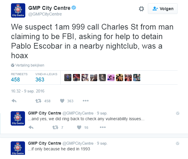 Pablo Escobar leeft en brengt zijn dagen door in nachtclubs van Engeland! Althans als we een 'oplettende' burger mogen geloven. Deze dronken meneer belde meerdere keren naar het alarmnummer 999 en zei dat hij drugsbaron Escobar in een nachtclub in de Engelse stad Manchester had gespot.