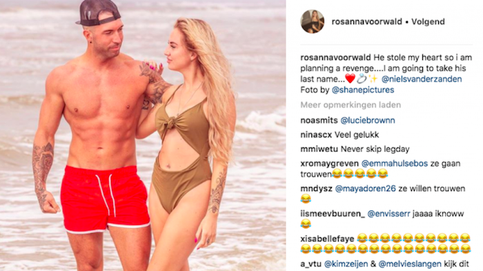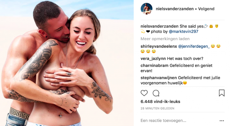 Niels hield het korter: hij plaatste een afbeelding waarbij hij zijn handen voor de blote borsten van Rosanna houdt en daarbij de tekst: "She said yes" met een ring.