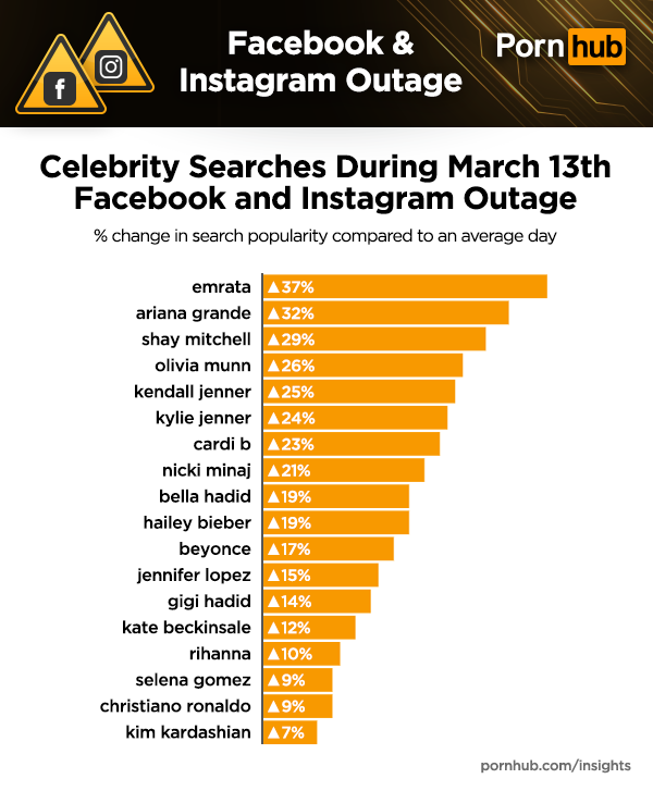 Volgens Pornhub was een soortgelijke toename aan websitebezoekers ook te zien toen er op 13 maart 2019 een Facebook-storing was. Op die dag was er volgens Pornhub een stijging van 72 procent wat betreft het aantal zoekopdrachten naar bekendheden. Zo werd er onder meer gezocht op Emily Ratajkowski, Kendall Jenner, Kylie Jenner, Cardi B en Rihanna. De enige mannelijke bekendheid waarop gezocht werd, was Cristiano Ronaldo. Waar de mensen afgelopen maandag op hebben gezocht, is (nog) niet bekend.