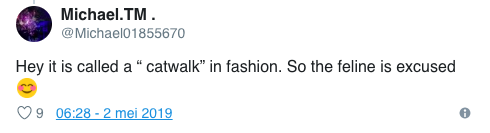 Een modeshow lopen voor Christian Dior doe je niet zomaar. Toch was er iemand die het lef had om tijdens de show in Marrakech tegen de richting de catwalk op te lopen: een straatkat! En dat zorgde voor een hoop reacties, want het werd ineens een echte 'cat-walk'. De modellen hadden trouwens geen aandacht voor de kat en liepen bloedserieus door, want the show must go on!