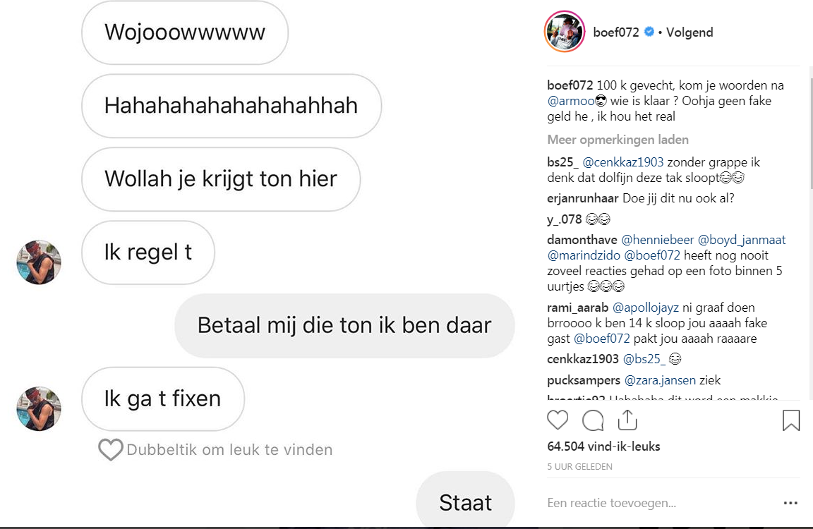 Armoo gaat op jacht naar de 100.000 euro en Boef ziet dat wel zitten. De Habiba-rapper accepteert de wedstrijd en waarschuwt de influencer die hij eerder diste op Instagram: "100k gevecht. Kom je woorden na @armoo?. Wie is klaar? Oh ja, geen fake geld he. Ik hou het real."