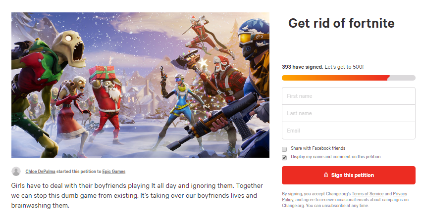 Op Change.org verschijnen massaal petities waarin vrouwen oproepen om de game Fortnite te verbieden. De liefde en aandacht die ze vroeger van hun vriendjes of partners kregen, is in veel van die gevallen blijkbaar verdwenen. De dames willen de populaire game daarom zo snel mogelijk naar Tupac, Aaliyah en Bob Marley sturen.