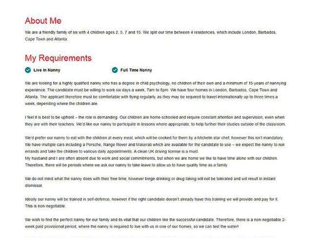 Een Brits gezin zoekt een superoppas voor hun vier kinderen en daar hebben ze veel voor over. Je krijgt 110.000 euro per jaar, mag rondrijden in supercars (o.a. Maserati, Range Rover en een Porsche), koken doet een sterrenchef en je zal heen en weer moeten reizen tussen hun huizen in Barbados, Kaapstad, Londen en Atlanta.In de advertentie op de website van Childcare is te lezen dat het Britse paar een flink eisenpakket heeft. De ouders van de kids eisen dat je zelf geen kinderen hebt, een diploma in kinderpsychologie, vijftien jaar ervaring en je moet bereid zijn om zes dagen per week van 7 uur 's ochtends tot 20 uur 's avonds te werken.Werkzaamheden- Boodschappen doen- Kinderen (2, 5, 7 en 15 jaar oud) naar hun afspraken brengen- Mee-eten met de kids- Meedoen met de thuislessen van de kinderenAls nanny mag je heel veel, behalve zuipen en drugs gebruiken. Dan wordt je onmiddellijk ontslagen.