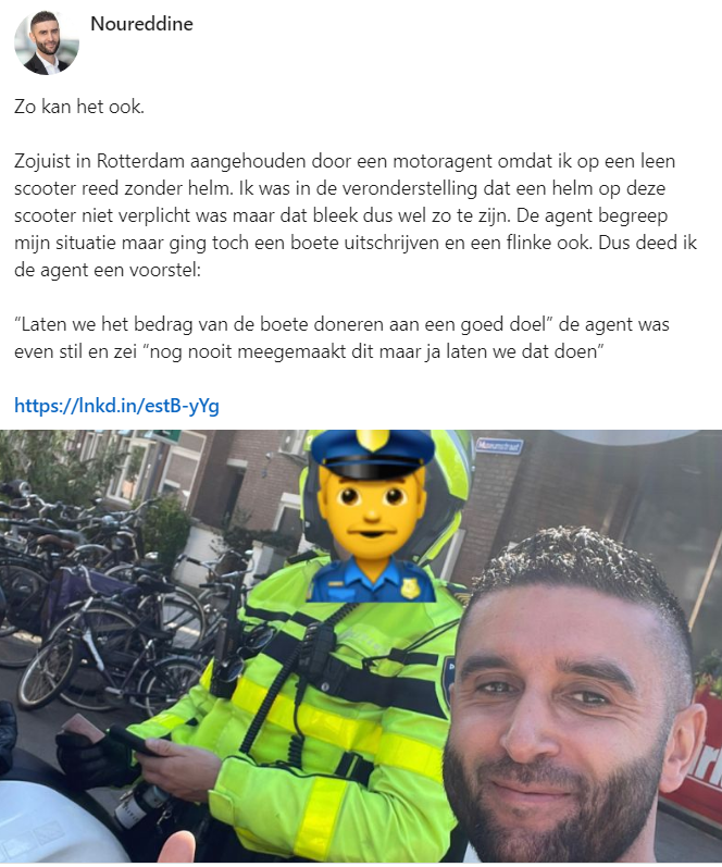 Als je door de politie een boete krijgt uitgedeeld, kom je daar meestal niet zo makkelijk meer onderuit. Toch wist Noureddine een bijzondere deal te sluiten met de agent die hem bekeurde voor het scooterrijden zonder helm. In een bericht dat inmiddels viral gaat op LinkedIn legt hij uit met welk idee hij een positieve draai aan de situatie wist te geven.