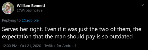 Het verhaal van deze opvallende date startte opnieuw de discussie op social media over wie moet betalen bij een date. Op Twitter zegt iemand: "De man moet betalen uit fatsoen, maar om 23 mensen mee te nemen is onacceptabel." Iemand anders zei: "Dat is karma. De verwachting dat de man betaalt, is sowieso echt niet meer van deze tijd."