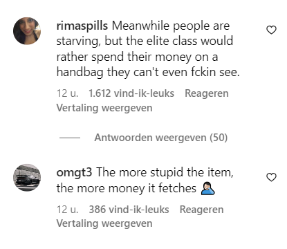 De miniatuur handtas maakt de tongen los van Instagramgebruikers. Zo reageert iemand: "Ondertussen verhongeren mensen, maar de eliteklasse geeft haar geld liever uit aan een handtas die ze niet eens kunnen zien." Een andere gebruiker zegt: "Hoe stommer het item, hoe meer geld het vangt." Andere gebruikers maken grappen en willen de tas opeten of zijn bang om het te inhaleren.