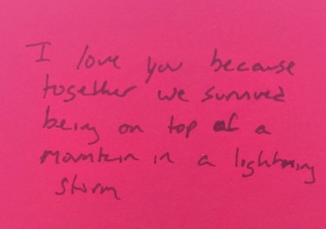 "Ik houd van je, omdat we het samen hebben overleefd op een berg tijdens een bliksemstorm"