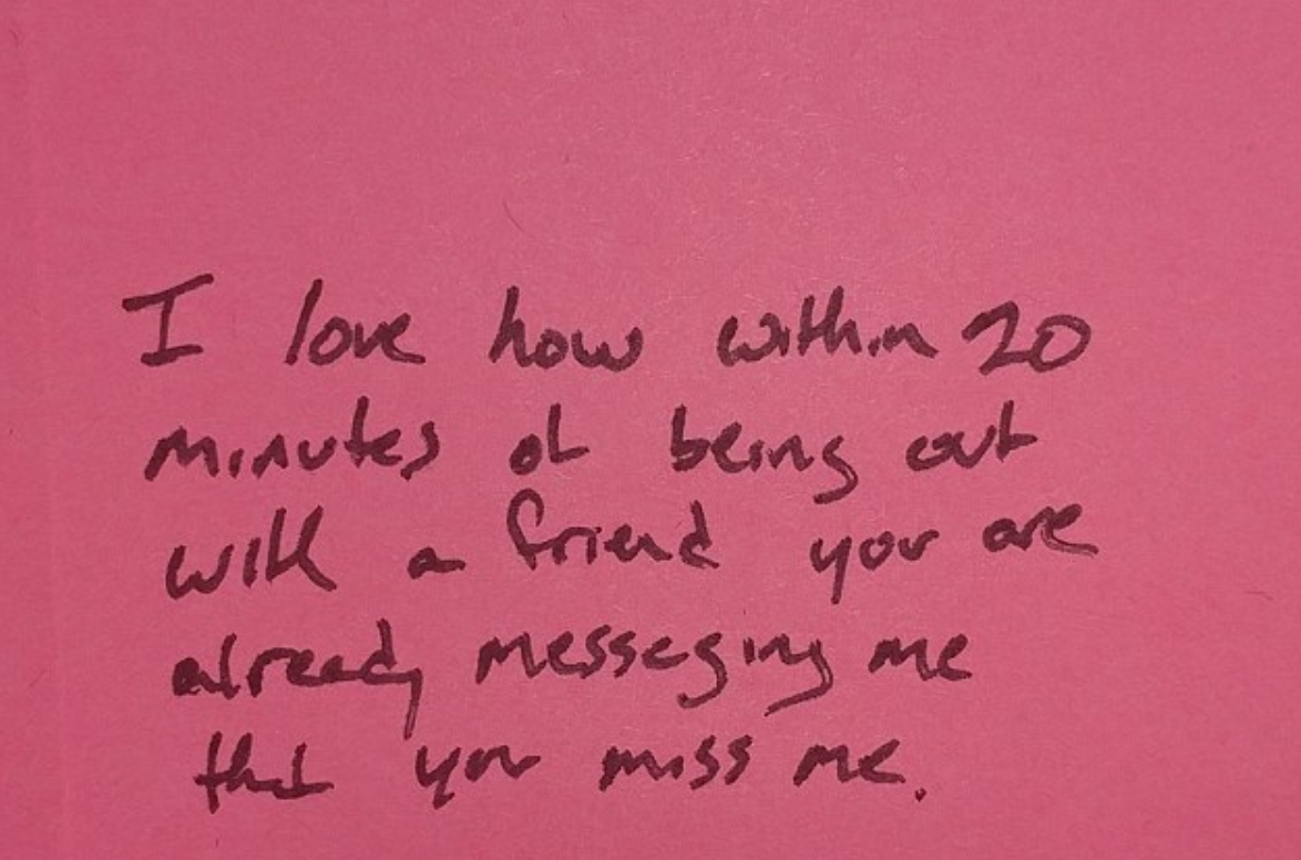 "Ik houd ervan dat als je met een vriendin uit bent, je mij binnen 20 minuten een berichtje stuurt dat je mij mist"