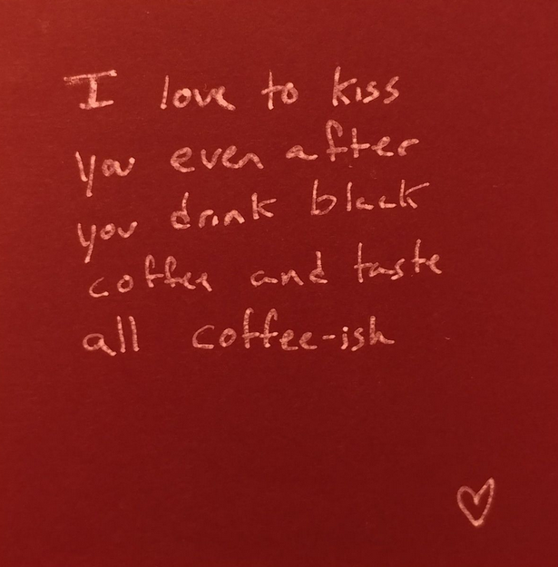 "Ik houd ervan om je te kussen, zelfs als je zwarte koffie hebt gedronken en je koffie-achtig 'smaakt' "