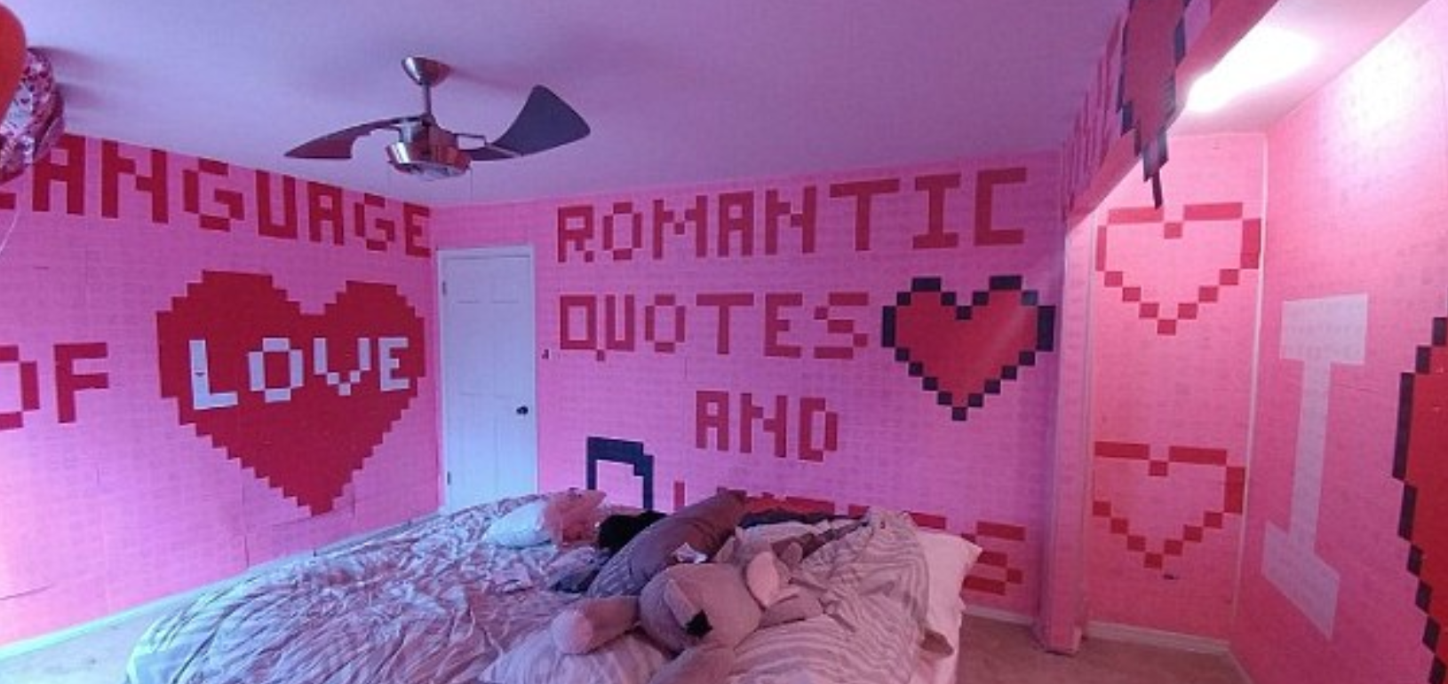 Jennifers man wilde hun kamer ombouwen, zodat het leek op een 8-bit videogame. En dat is aardig gelukt. Met meer dan 7000 plakbriefjes vormde hij enorme hartjes van briefjes met liefdesverklaringen. Jennifer maakte foto's van het eindresultaat en postte het online.