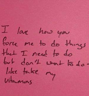 "Ik houd ervan dat je me dwingt om dingen te doen, die ik moet doen, maar niet wil doen, zoals mijn vitaminen slikken"
