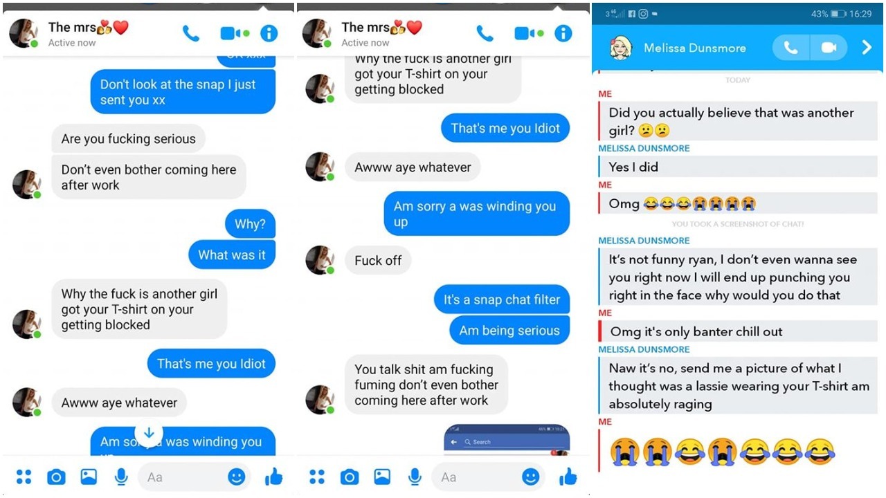 Ryan schrijft nog: "Dat ben ik idioot", maar zijn vriendin moet daar niets meer van hebben: "Ja tuurlijk, whatever. Fuck off." Ze gelooft hem zelfs niet als hij zegt dat het een Snapchat-filter is. Uiteindelijk heeft ze de grap door, maar hoeft ze hem nog steeds niet te zien: "Dat is niet grappig Ryan. Ik hoef je even niet te zien, want dan eindig je met een vuist in je gezicht. Waarom zou je dit doen?"
