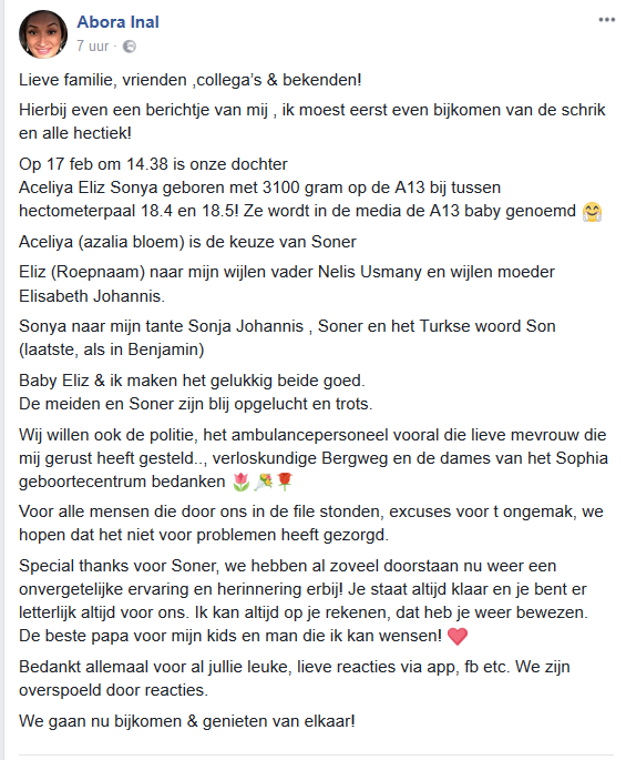 Op Facebook bedankt mama Abora de politie, het ambulancepersoneel, de verloskundigen, het personeel van het kinderziekenhuis en vooral die lieve mevrouw die haar gerust heeft gesteld. En natuurlijk haar man Soner: "We hebben al zoveel doorstaan nu weer een onvergetelijke ervaring en herinnering erbij! Je staat altijd klaar en je bent er letterlijk altijd voor ons. Ik kan altijd op je rekenen, dat heb je weer bewezen. De beste papa voor mijn kids en man die ik kan wensen!"