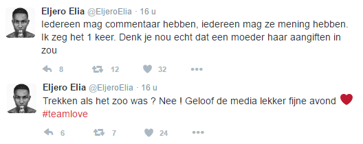 Op Twitter ontstond wat commotie rondom het gebaar dat Elia maakte, maar de voetballer blijft SFB steunen en gelooft er heilig in dat zijn vrienden onschuldig zijn: "Iedereen mag commentaar hebben, iedereen mag zijn mening hebben. Ik zeg het 1 keer. Denk je nou echt dat een moeder haar aangifte in zou trekken als het zo was? Nee! Geloof de media lekker. Fijne avond ❤️ #teamlove"