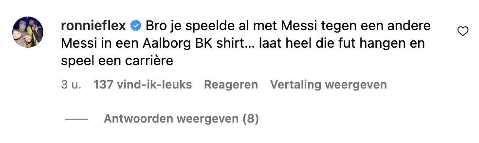 Gelukkig maakt niet iedereen zich er druk om. "Is het dan wel realistisch dat je een akka 3000 doet met overleden spelers?" vroeg iemand zich af op Instagram. Ook Ronnie Flex heeft zich gemengd in de discussie: "Bro je speelde al met Messi tegen een andere Messi in een Aalborg BK shirt… laat heel die fut hangen en speel een carrière"