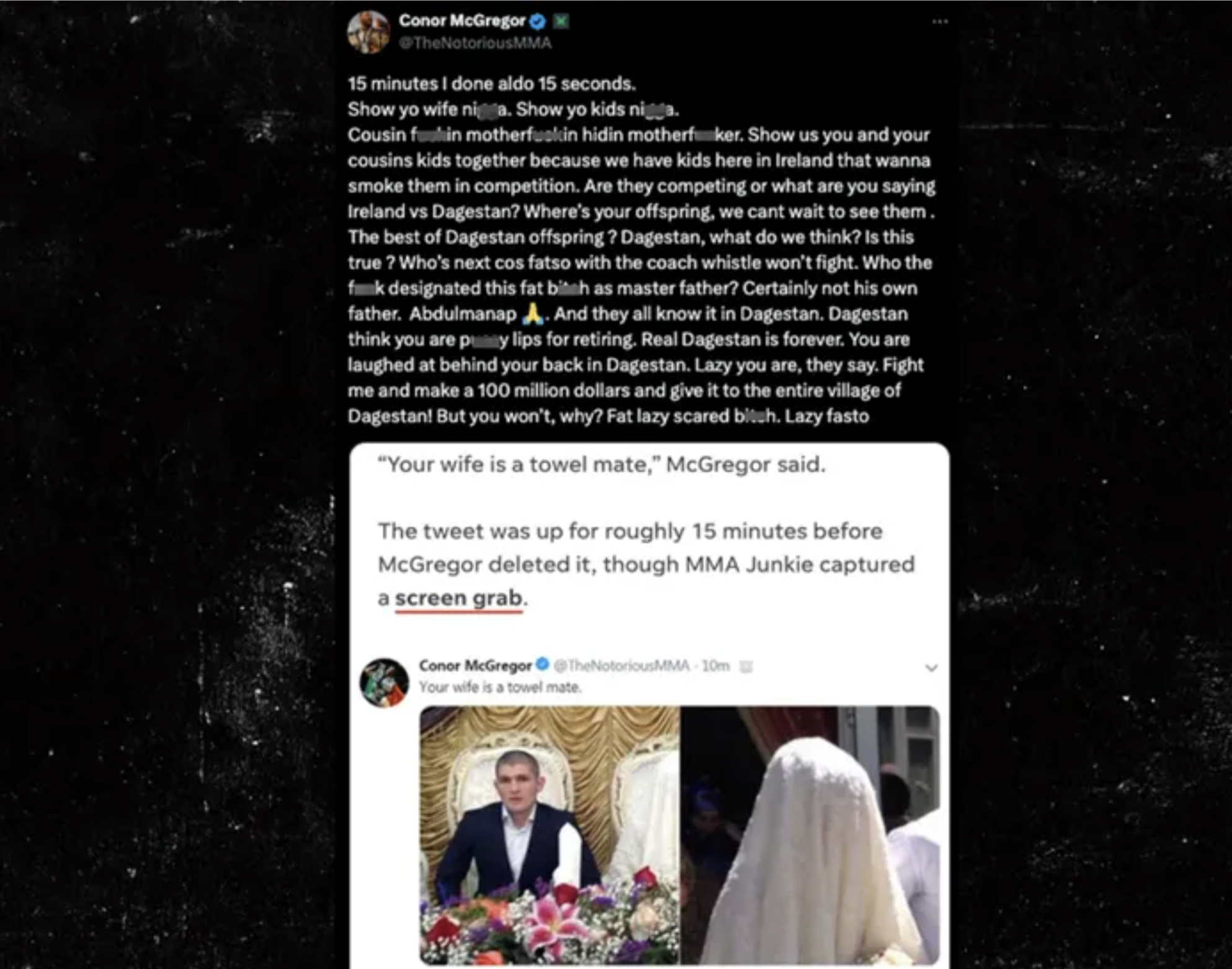 Conor McGregor zou afgelopen vrijdag op X allemaal beledigende tweets hebben geplaatst die gericht waren naar Khabib Nurmagomedov. Daarin zou McGregor niet alleen Khabib hebben beledigd, maar ook zijn familie en cultuur. Zo zou de 36-jarige Ier hebben geplaatst: "Laat je vrouw zien n****. Laat je kinderen zien n****. Je neukt je neef en je verstopt je. Laat ons jou en de kinderen van je neven zien, want we hebben hier in Ierland kinderen die ze willen verslaan in competitie. Ierland tegen Dagestan. Waar zijn je kinderen, we kunnen niet wachten om ze te zien."