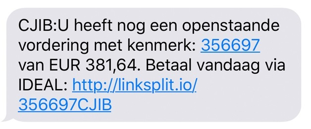 De laatste tijd circuleren er weer valse smsjes uit naam van het Centraal Justitieel Incassobureau (CJIB) waarin staat dat je nog een openstaande vordering hebt. Trap hier niet in! In de sms staat: 'CJIB: U heeft nog een openstaande vordering met kenmerk: ...... van 381,64.' Als je op de link drukt, kom je op een betaalverzoek van een bank. Dit bericht is altijd nep en volgens het CJIB verstuurd door oplichters!