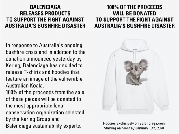 Voor het weekend maakte Balenciaga via haar Instagram Stories bekend Australië te steunen door het verkopen van hoodies en shirts, waar een koala op te zien is. In de aankondiging is onder andere te lezen: "Balenciaga heeft besloten shirts en truien uit te brengen waar een afbeelding van de kwetsbare Australische koala op te zien is." De keuze voor de koala valt te verklaren: bij de bosbranden zijn namelijk 30% van alle koala's in het land gestorven. De opbrengst van de shirts zal gedoneerd worden aan een plaatselijke organisatie met betrekking tot bos- en natuurbeheer, uitgekozen door Balenciaga en de Kering Group, waar Balenciaga onder valt.
