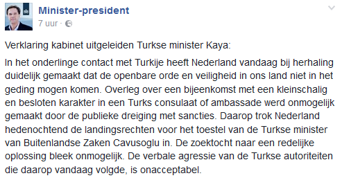 In Rotterdam is de rust teruggekeerd, maar tussen Turkije en Nederland moet nog flink wat gladgestreken worden. Premier Rutte zei vanochtend bij WNL op Zondag dat hij het feit dat minister Kaya toch naar Nederland was gekomen onacceptabel vond: "Ik heb gisteren tot acht keer toe met premier Yildirim aan de telefoon gezeten. (..) We hebben dit nog nooit meegemaakt, dat een land zegt dat iemand niet welkom is en dat ze dan toch komen."