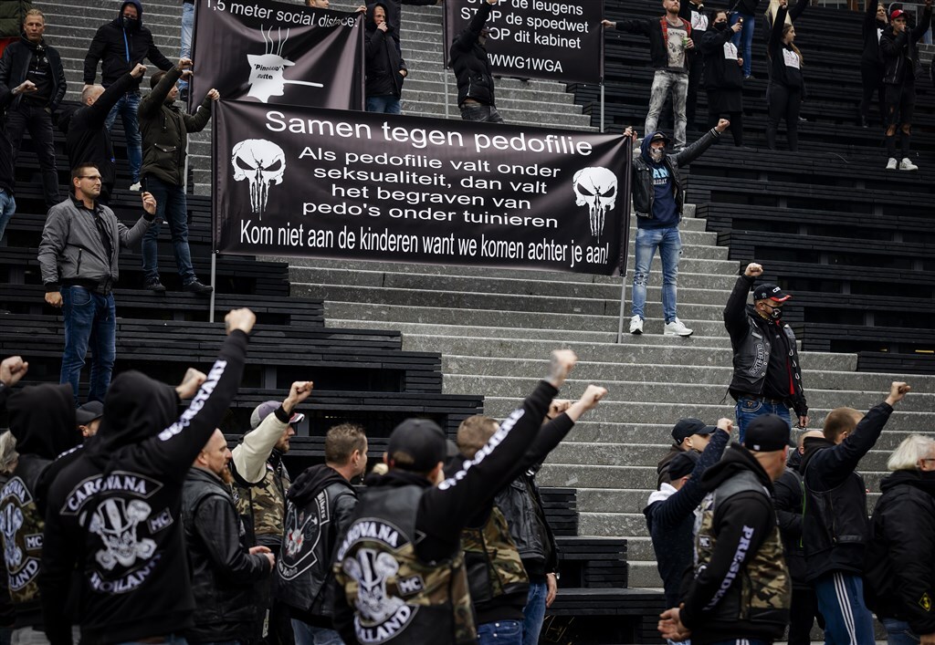 Een paar honderd demonstranten verzamelden zich zondagmiddag op het Jaarbeursplein in Utrecht om tegen pedofilie te demonstreren. Niet iedereen droeg een mondkapje, maar de organisatie vroeg wel herhaaldelijk om voldoende afstand te houden.