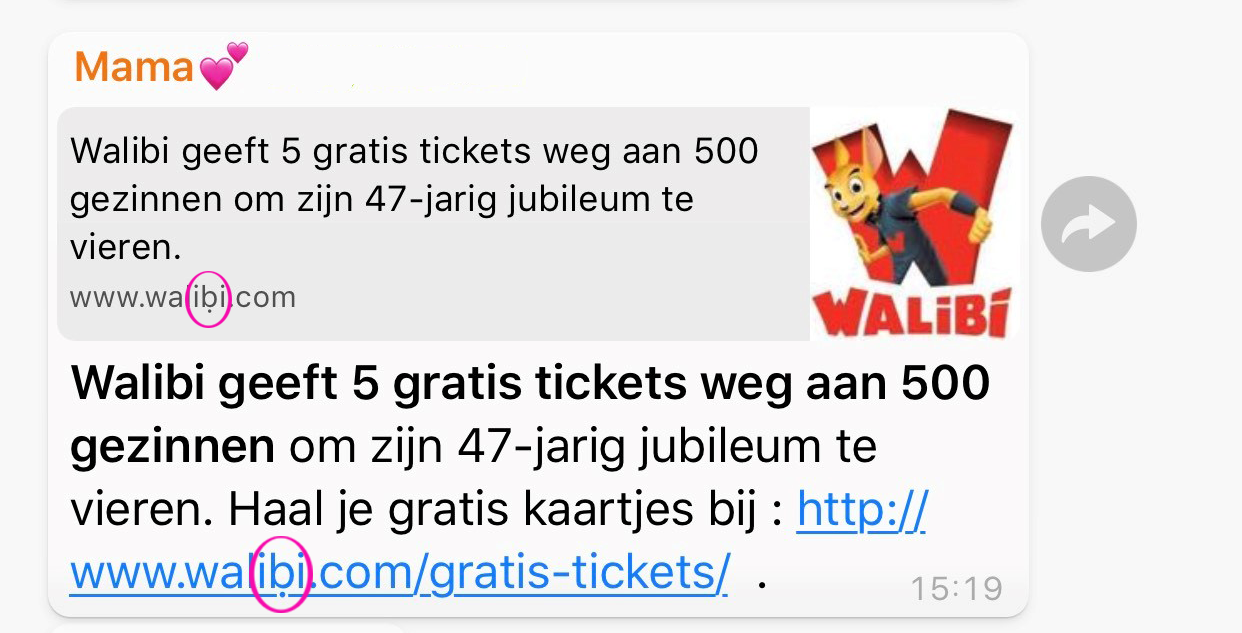 In de WhatsApp-berichten staat dat de Efteling en Walibi jarig zijn en daarom blijkbaar aan 500 gezinnen vijf gratis kaarten weggeven. De link lijkt wel enorm op de officiële website, maar is net een tikkeltje anders. Bij het onderstaande screenshot van de Walibi-actie zie je als je heel goed kijkt dat er geen normale 'b' in de link zit, maar een 'b' met een puntje eronder.