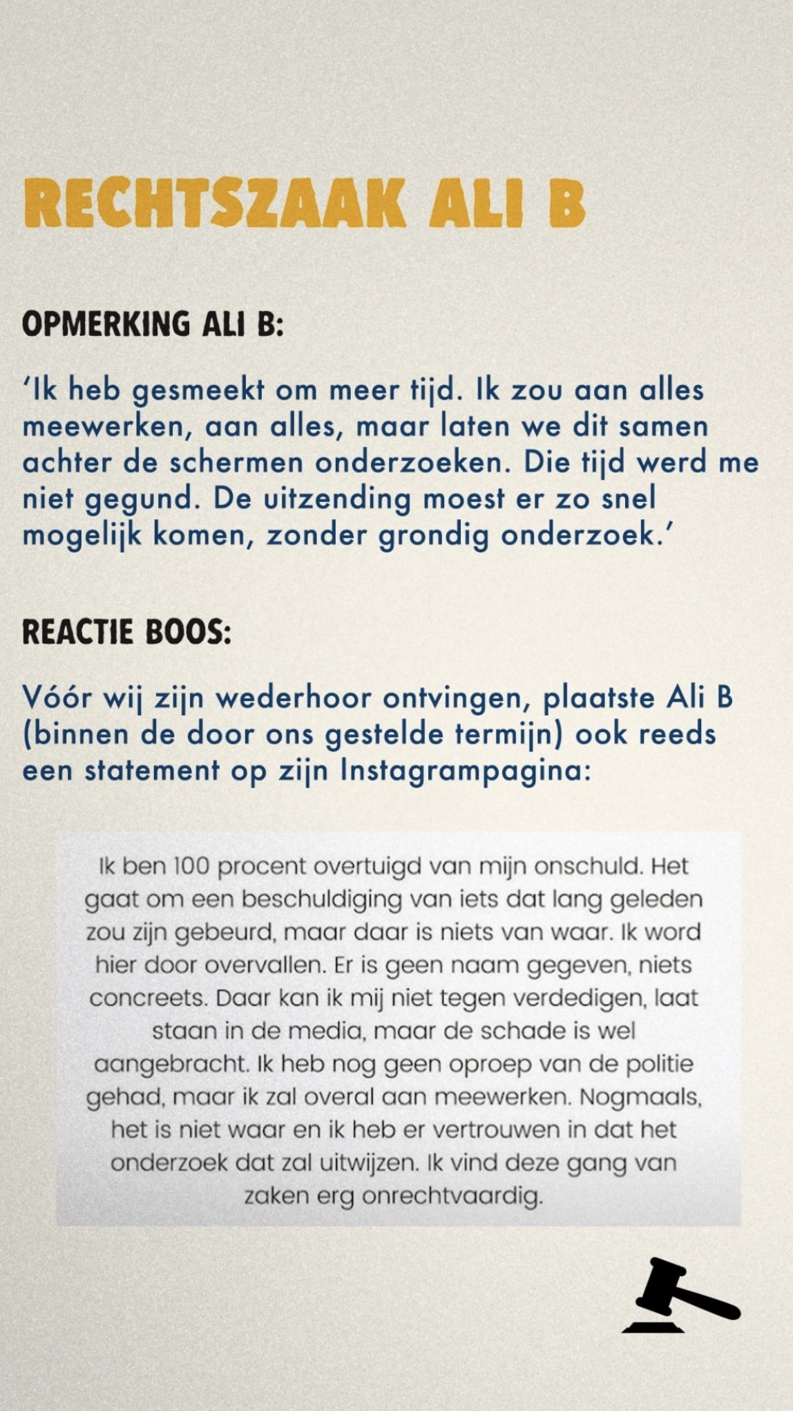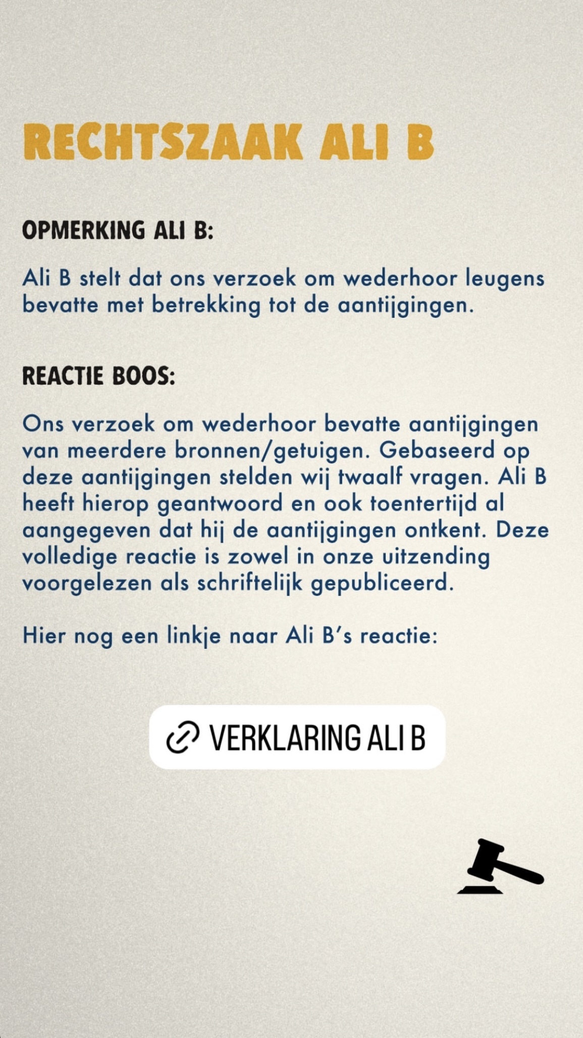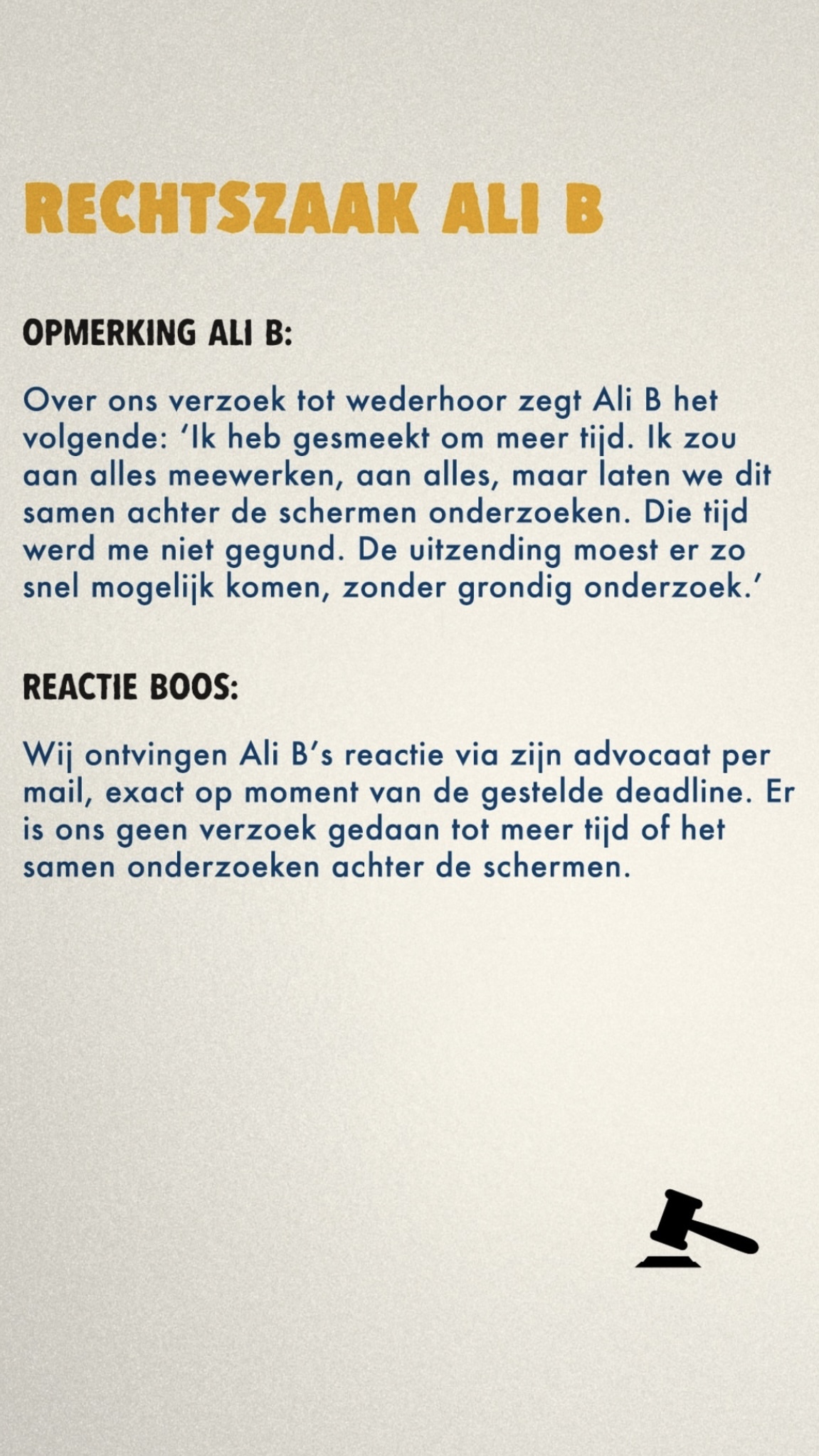 Ali B trapte de zitting vandaag af met een geschreven brief, die hij huilend voorlas. Daarin zei hij onder meer dat journalisten leugens hebben verspreid en verwees hij specifiek naar Tim Hofman en BOOS. "Ik heb gesmeekt om meer tijd. Ik zou aan alles meewerken, aan alles, maar laten we dit samen achter de schermen onderzoeken. Die tijd werd me niet gegund. De uitzending moest er zo snel mogelijk komen, zonder grondig onderzoek."