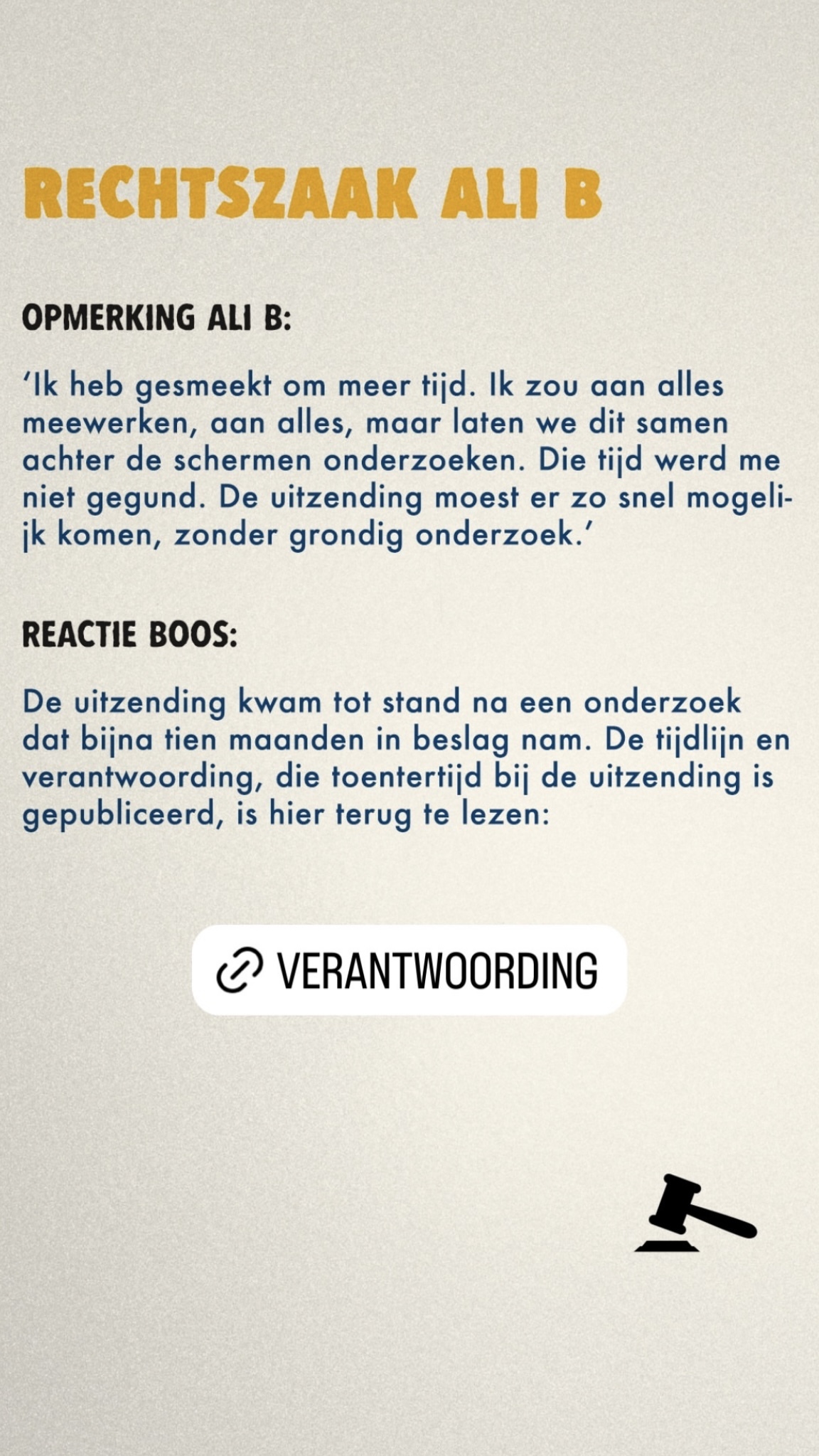 De redactie reageert ook op het verwijt dat "de uitzending er zo snel mogelijk moest komen". Volgens BOOS klopt dat niet en nam het volledige onderzoek bijna tien maanden in beslag. In hun Instagram Story hebben ze de link naar het bewijs ter verantwoording toegevoegd, zodat mensen de feiten eventueel zelf na kunnen gaan. Ook hebben ze een link toegevoegd naar Ali B's reactie tijdens het onderzoek, om aan te tonen dat ze wederhoor hebben toegepast en hun verhaal geen leugens bevat. "Deze volledige reactie is zowel in onze uitzending voorgelezen als schriftelijk gepubliceerd."