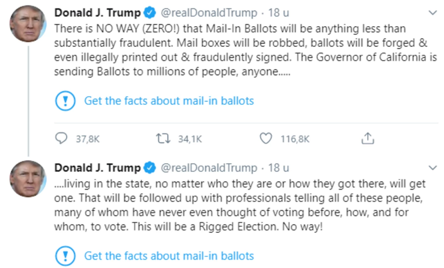 Onder de twee tweets waarin Trump spreekt over de fraude rondom het stemmen heeft Twitter een link geplaatst met de tekst 'lees hier de feiten over stembiljetten per post'. Als je erop klikt, kom je bij informatie met bronnen van experts die Trumps uitspraken tegenspreken.