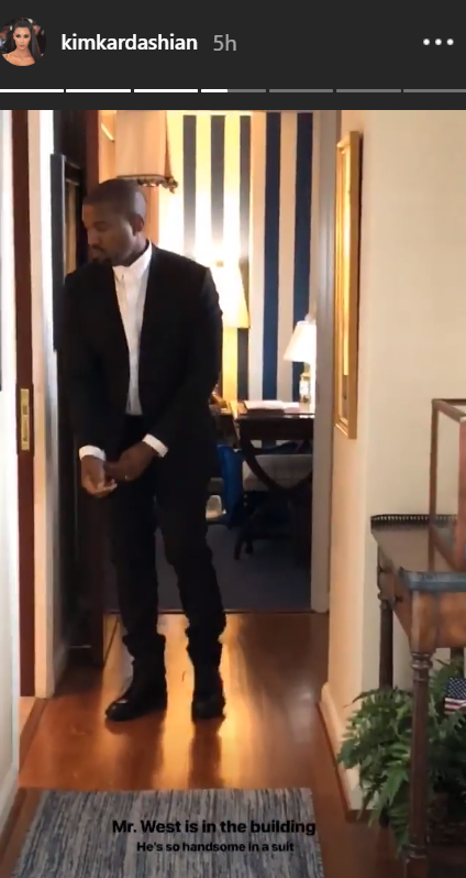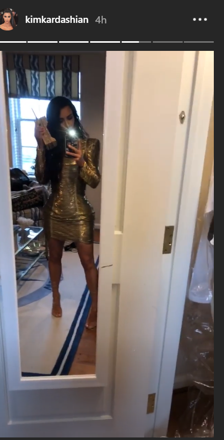 Kim liet ook zien hoe zij en Kanye zich klaarmaakten voor de bruiloft. Zij ging gekleed in een gouden minijurk en een handtas in de vorm van een mega old skool telefoon en Ye ging voor een clean look in een zwart kostuum met wit overhemd.