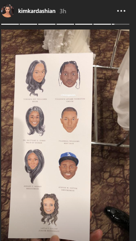 Kim Kardashian deelde op haar Insta Stories het programmaboekje van de dag met daarop een afbeelding van iedereen met een speciale rol naast de bruid en bruidegom. Dat Pharrell de man naast Pusha mag zijn op zo'n bijzondere dag is niet vreemd. Volgens HotNewHipHop zijn de twee al close sinds sinds het uitbrengen van de 2002-hit Grindin'.