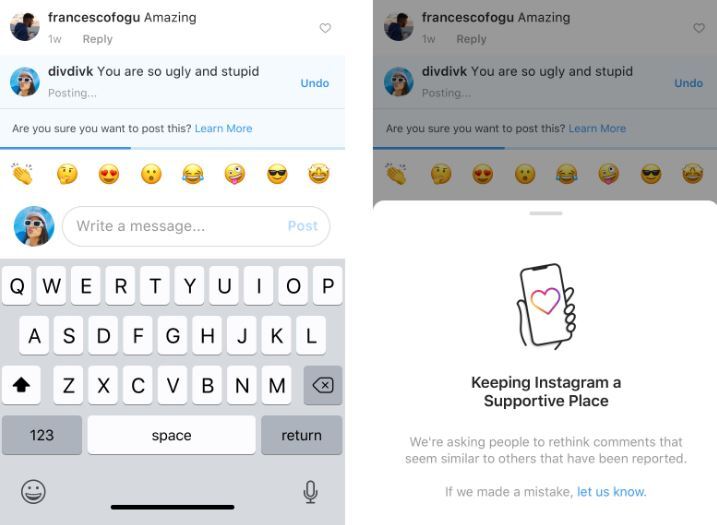 Instagram introduceert een tool die woorden en stukjes zin herkent die vaak worden gerapporteerd als ongepast. Wanneer iemand dit wilt posten, krijgt diegene een melding: 'Weet je zeker dat je dit wilt plaatsen?'. De 'pester' kan deze melding negeren, maar volgens Instagram is uit verschillende tests gebleken dat de beledigende teksten inderdaad gewist worden.