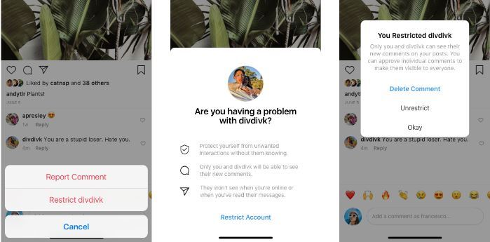 De tweede nieuwe functie is Restrict. Instagrammers kunnen daarmee vervelende berichtjes voortaan wegfilteren zonder dat ze daarbij iemand hoeven te blokkeren. Volgens Instagram hebben veel jonge mensen namelijk moeite met het blokkeren of ontvolken van iemand waar ze in het echte leven contact met mee hebben.