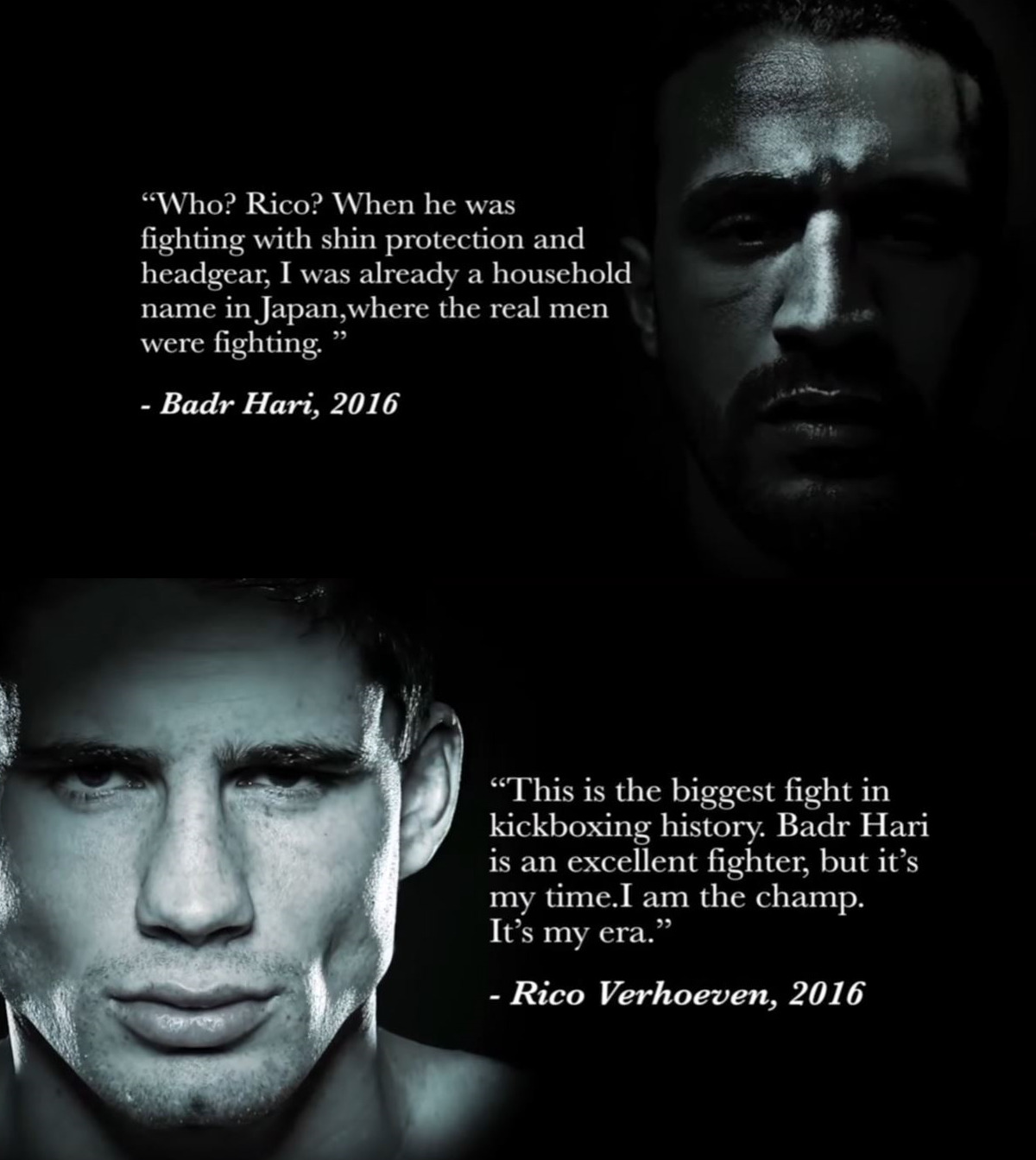 Beide vechters zijn absoluut zeker van hun zaak. Rico Verhoeven is op dit moment zevenvoudig wereldkampioen. Hij beseft maar al te goed dat het voor Badr Hari best wel eens de laatste wedstrijd kan zijn, terwijl Rico nog veel wedstrijden in het vooruitzicht heeft.