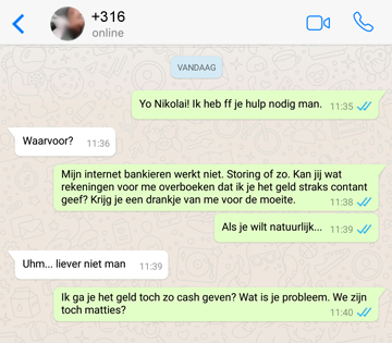De oplichters sturen je een bericht via WhatsApp. Hiervoor gebruiken ze een onbekend nummer, maar wel met een profielfoto van een bekende. Denk bijvoorbeeld aan een familielid of een vriend(in). Na een kort gesprek vragen ze of je kan helpen met het betalen van rekeningen. Met smoezen als "internetbankieren doet het even niet" laten ze je een bedrag voorschieten. Vervolgens ben jij het geld voorgoed kwijt en zijn de dieven onvindbaar.