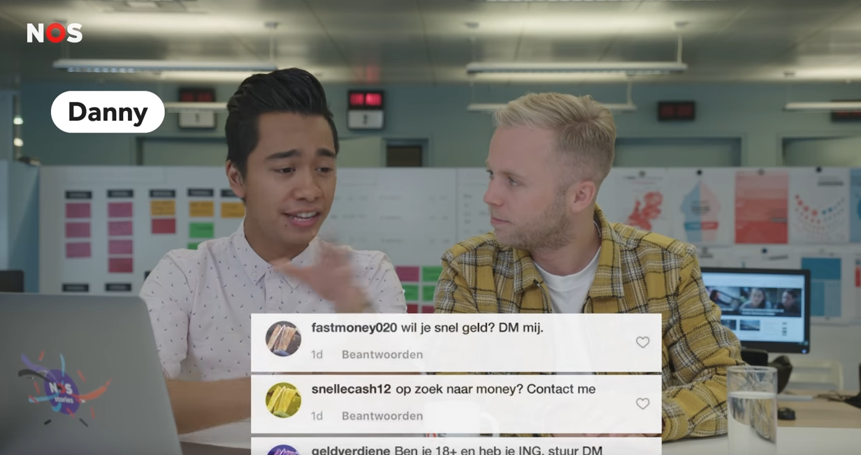 'Snel geld verdienen? Stuur mij dan een dm!' Die oproep heb je vast vaker als comment op Instagram gezien. Zo'n bericht kan verleidelijk zijn als je in de financiële problemen zit of gewoon snel geld nodig hebt. Maar wat gebeurt er als je erop ingaat? Op het nieuwe kanaal van de NOS, NOS Stories zochten Jeroen en Danny dit uit.