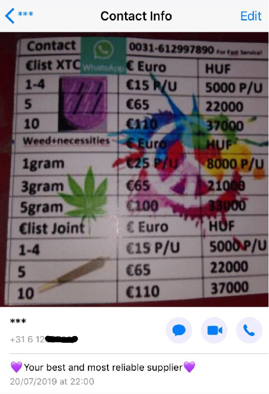 Op de prijslijst staat ook een Nederlands telefoonnummer waarop de dealers te bereiken zijn. Dat nummer is niet meer in gebruik maar op Whatsapp prijzen de jongens zichzelf aan als 'Your best and most reliable supplier'.