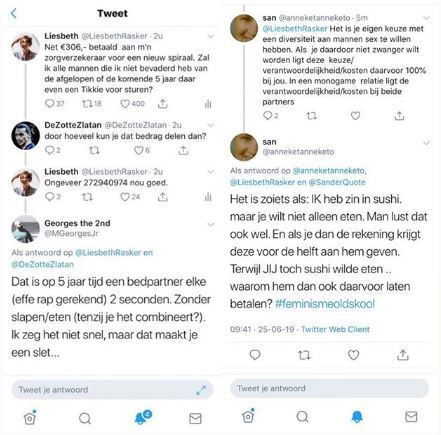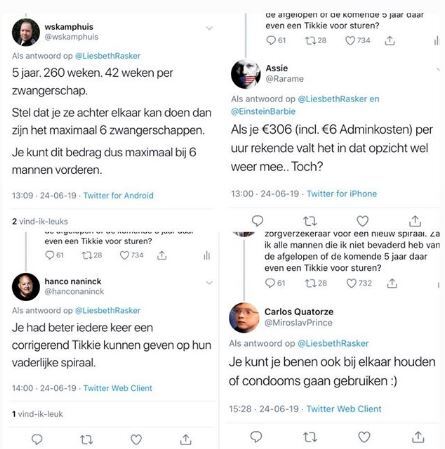 Journalist Liesbeth Rasker vroeg zichzelf op Twitter hardop af of ze de €360 aan spiraalkosten zou moeten delen met haar bedpartners: "Zal ik alle mannen die ik niet bevaderd heb van de afgelopen of de komende 5 jaar daar even een Tikkie voor sturen?" Tot haar grote verbazing kwamen er honderden reacties op de tweet. Vooral van boze of verontwaardigde mannen, vertelt ze bij Zomer met Art. In haar Instagramstory deelden ze een aantal van die reacties.