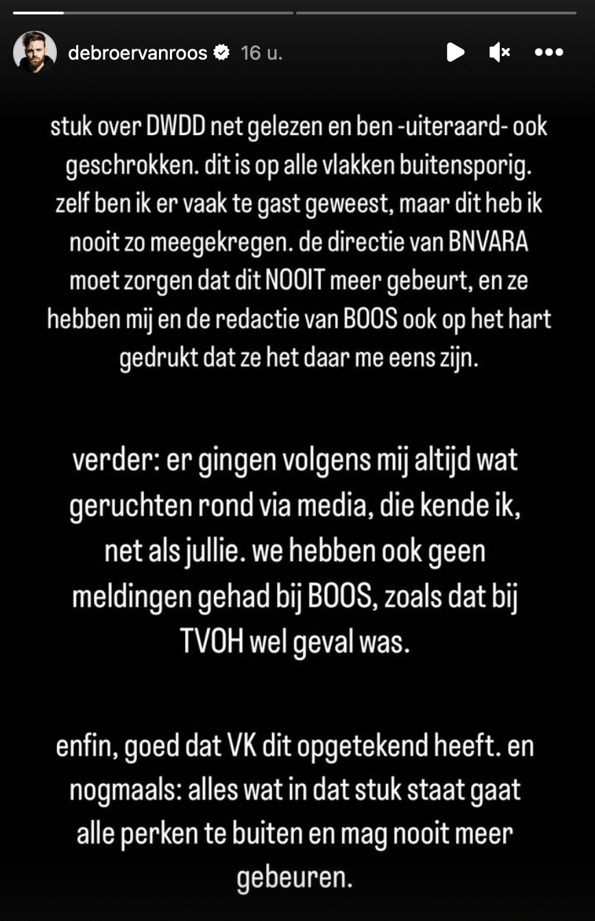 Maar de staatssecretaris is niet de enige die reageert op het artikel van de Volkskrant. Tim Hofman, zelf ook presentator bij BNNVara, laat weten geschrokken te zijn van het nieuws. "Dit is op alle vlakken buitensporig", schrijft hij op Instagram. "De directie van BNNVARA moet zorgen dat dit nooit meer gebeurt."